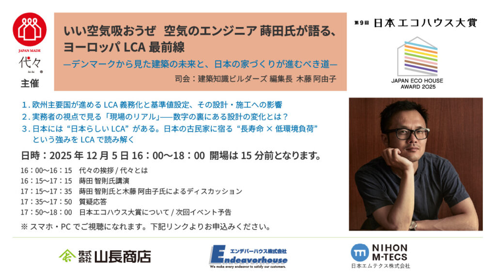 本セミナーは、日本エコハウス大賞に協賛している3社(エンデバーハウス、日本エムテクス、山長商店)で協業している 代々 主催のオンラインセミナーです。
