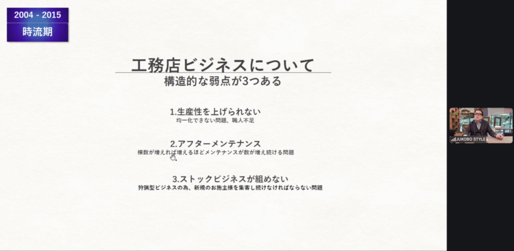 2003年ごろまでを我流期とし、この頃は、設計力、大工の技術(手仕事)を強みに、年間4〜5棟を完工。