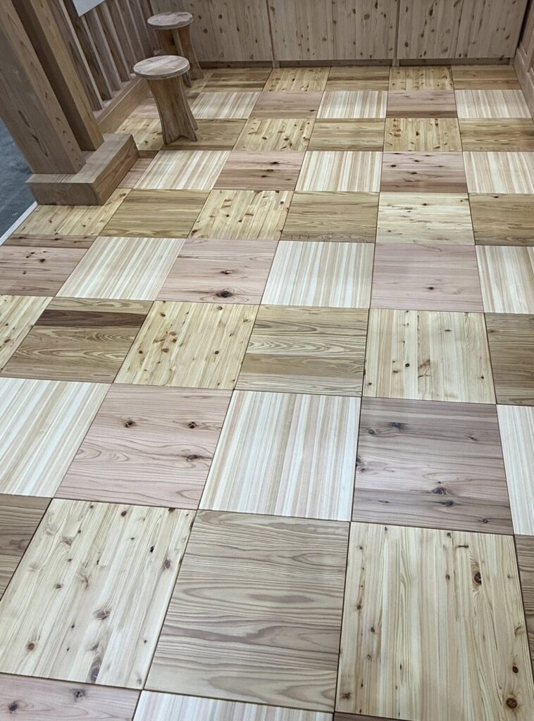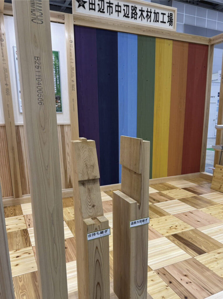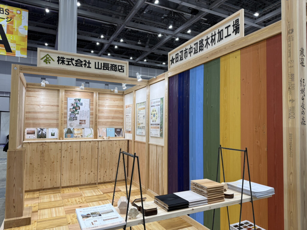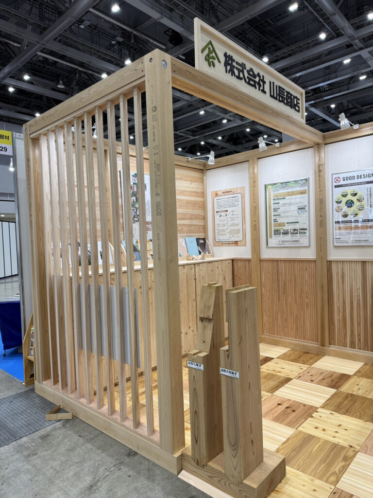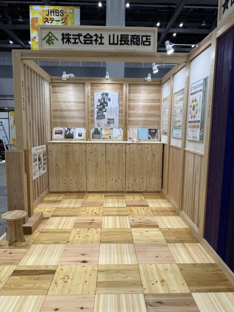 山長商店のブースでは、七色に塗装した外装材、杉と桧で作った4種類の床パネルなど、構造材から内装材まで、実際の木材製品に触れていただきながら色んな提案をさせていただきました。