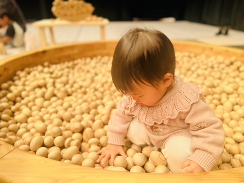 ハイハイができるようになった赤ちゃんから、子どもの付き添いでやってきた大人まで、ついつい夢中になってしまう木のおもちゃ。