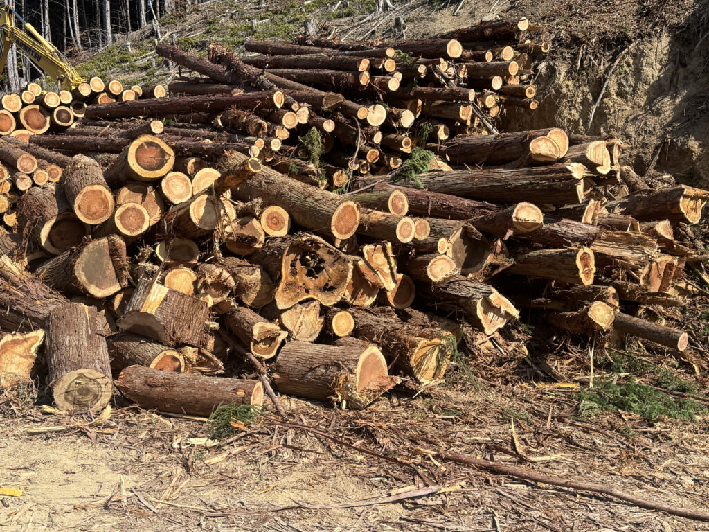 住宅用の構造材や板材などに使えない部分(手前の短く切った木材)は、チップやバイオマス用材として活用します。